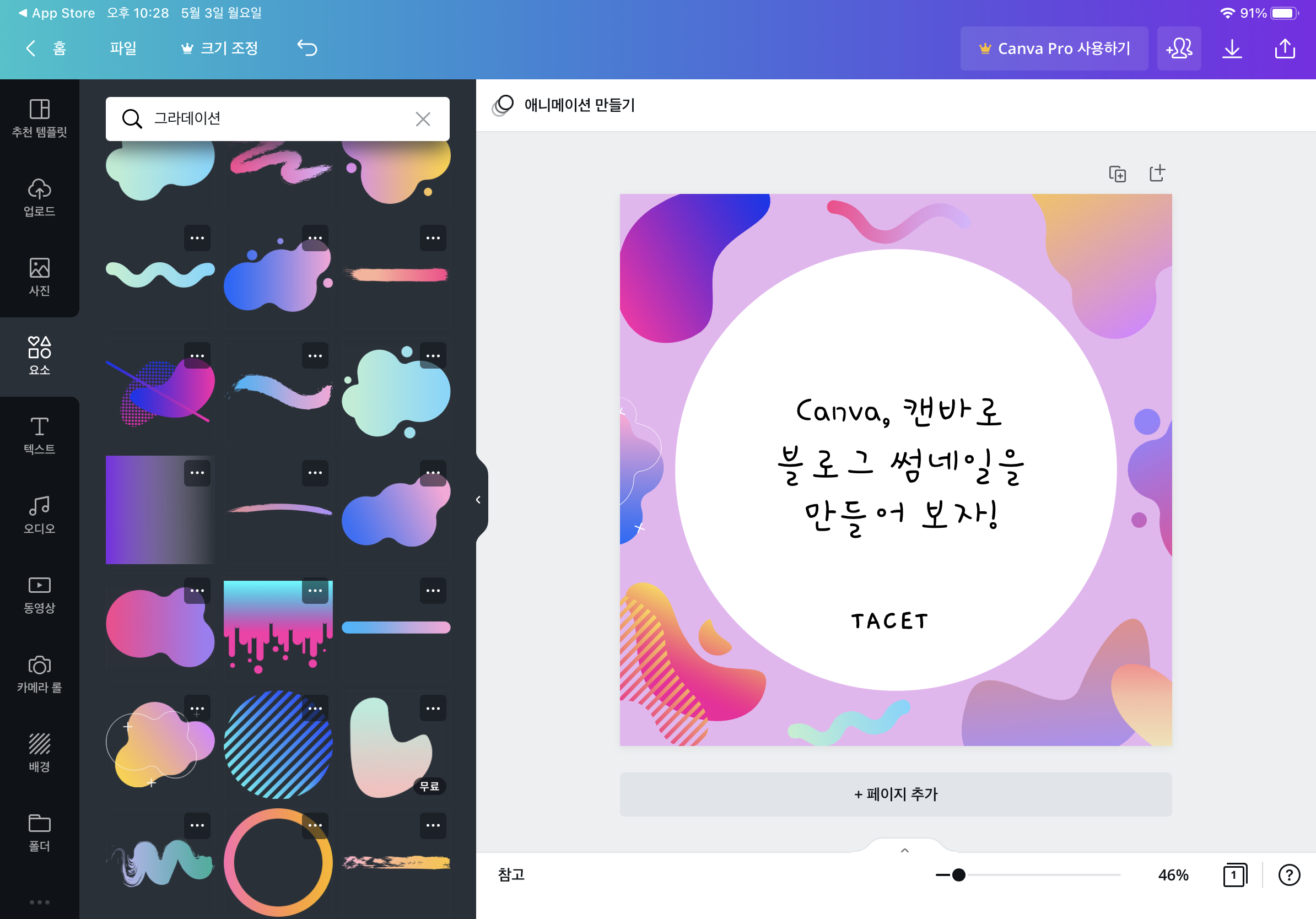 왼쪽 세로 메뉴에서 '요소'를 누르고 그 중에서도 그라데이션 도형들만 검색했습니다.