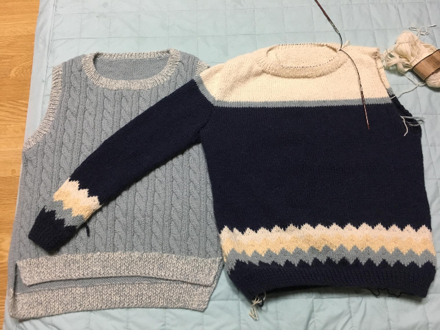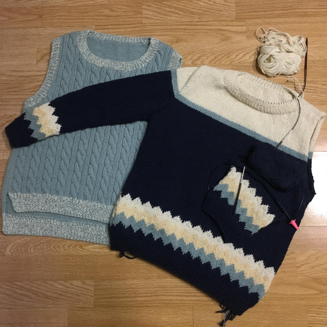 그리고 그 전 수업 때 완성했던 꽈배기 무늬 조끼와 나란히 찍어봤습니다.