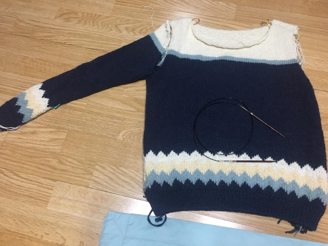 막판에 배색 수정작업만 안 했어도 나머지 소매까지 떠올 수 있었을 텐데